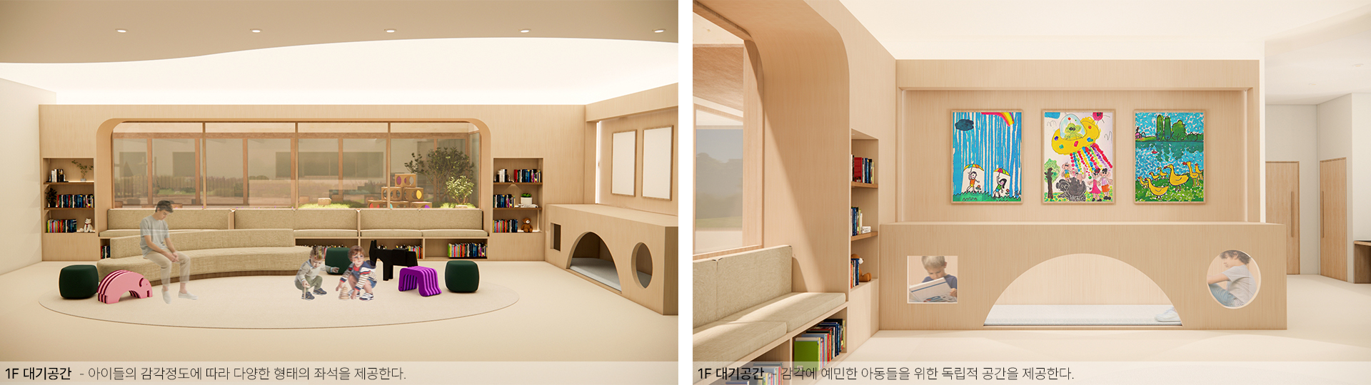 프리즘과 스펙트럼의 개념을 공간에 적용하여, 아이가 자신만의 내면의 색을 찾아가는 여정을 표현하고자 한다. 빛그린은 단순한 치료 공간을 넘어, 모든 아동의 개별성, 가능성, 다양성을 존중하는 열린 환경을 지향한다. 이는 공간을 통해 아이들이 스스로를 이해하고, 세상과 연결되며, 더 넓은 사회로 나아갈 수 있도록 돕는 중요한 첫걸음이 된다.