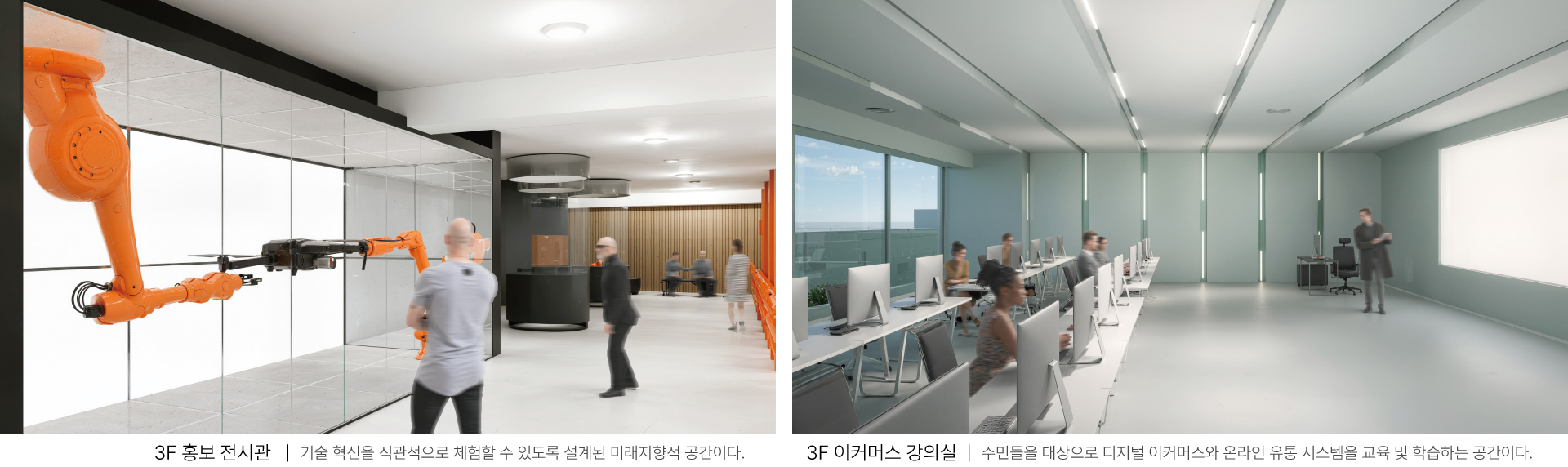 공간은 복합 유통 허브, 공유형 작업 공간, 커뮤니티 라운지, 친환경 설비 존 등으로 구성되며, 다양한 주체들이 협력하고 일상적으로 활용할 수 있는 열린 물류 생태계를 제안하고자 한다.